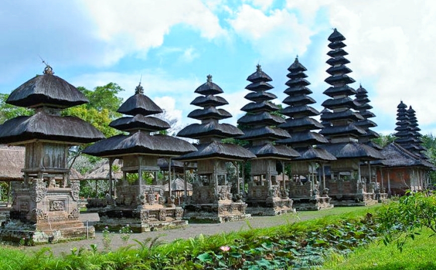 The temple complex is famous for its harmonious blend of traditional Balinese architecture and carefully designed gardens. Upon arrival, visitors are welcomed by a wide entrance bridge that crosses a large surrounding moat, symbolizing protection and purity. The lush green lawns and symmetrical layout give the area a peaceful, royal atmosphere that feels very different from the busier temples in Bali.