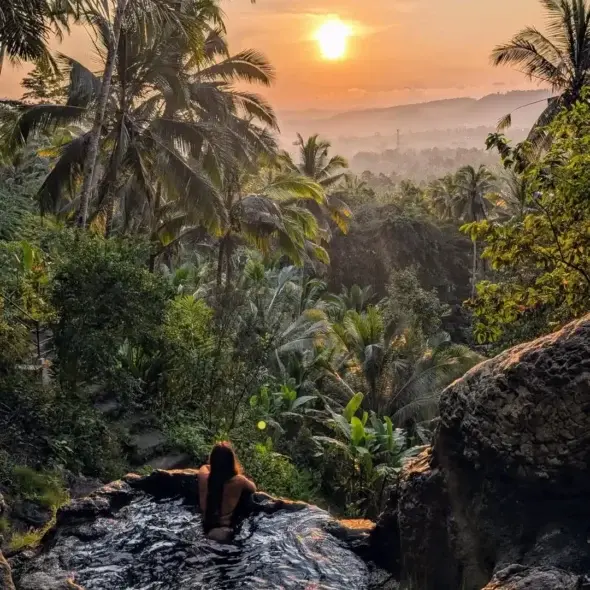 Your adventure begins at Gembleng Waterfall, a peaceful hidden gem surrounded by lush tropical forest in Sidemen. This small but stunning waterfall features natural infinity pools carved into the rocks, where you can take a refreshing dip while enjoying breathtaking views of rice terraces and mountains. It’s the perfect place to relax and connect with nature.